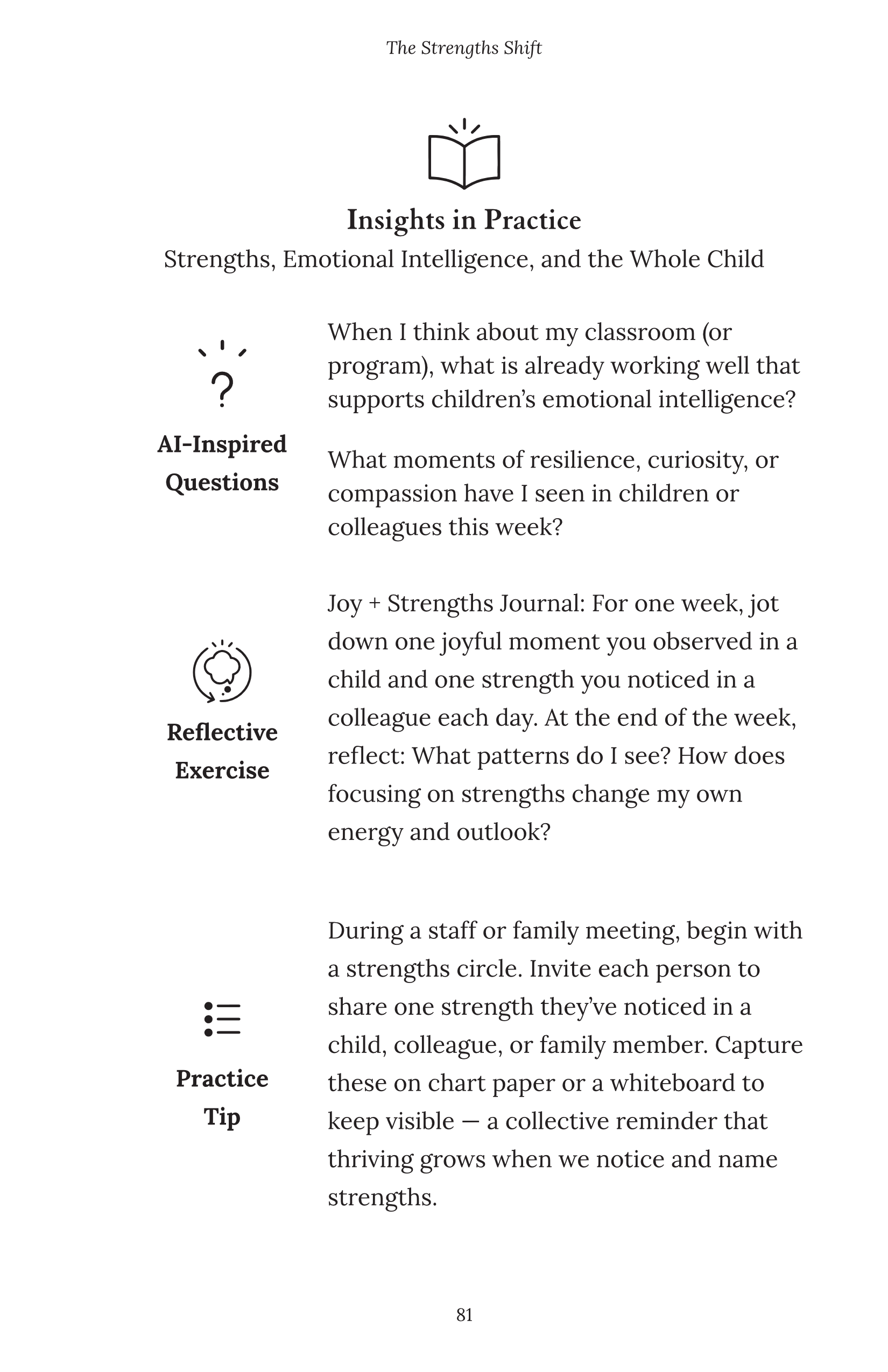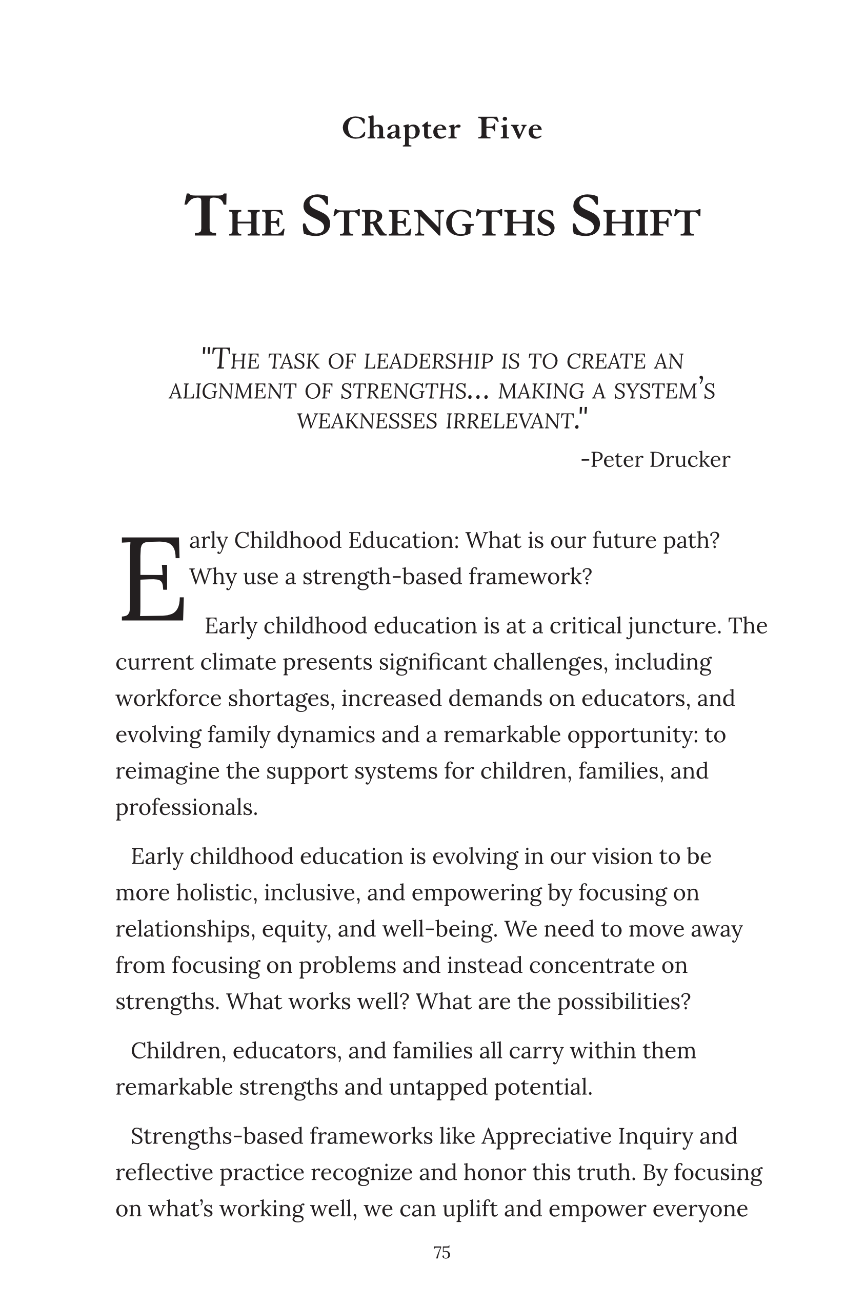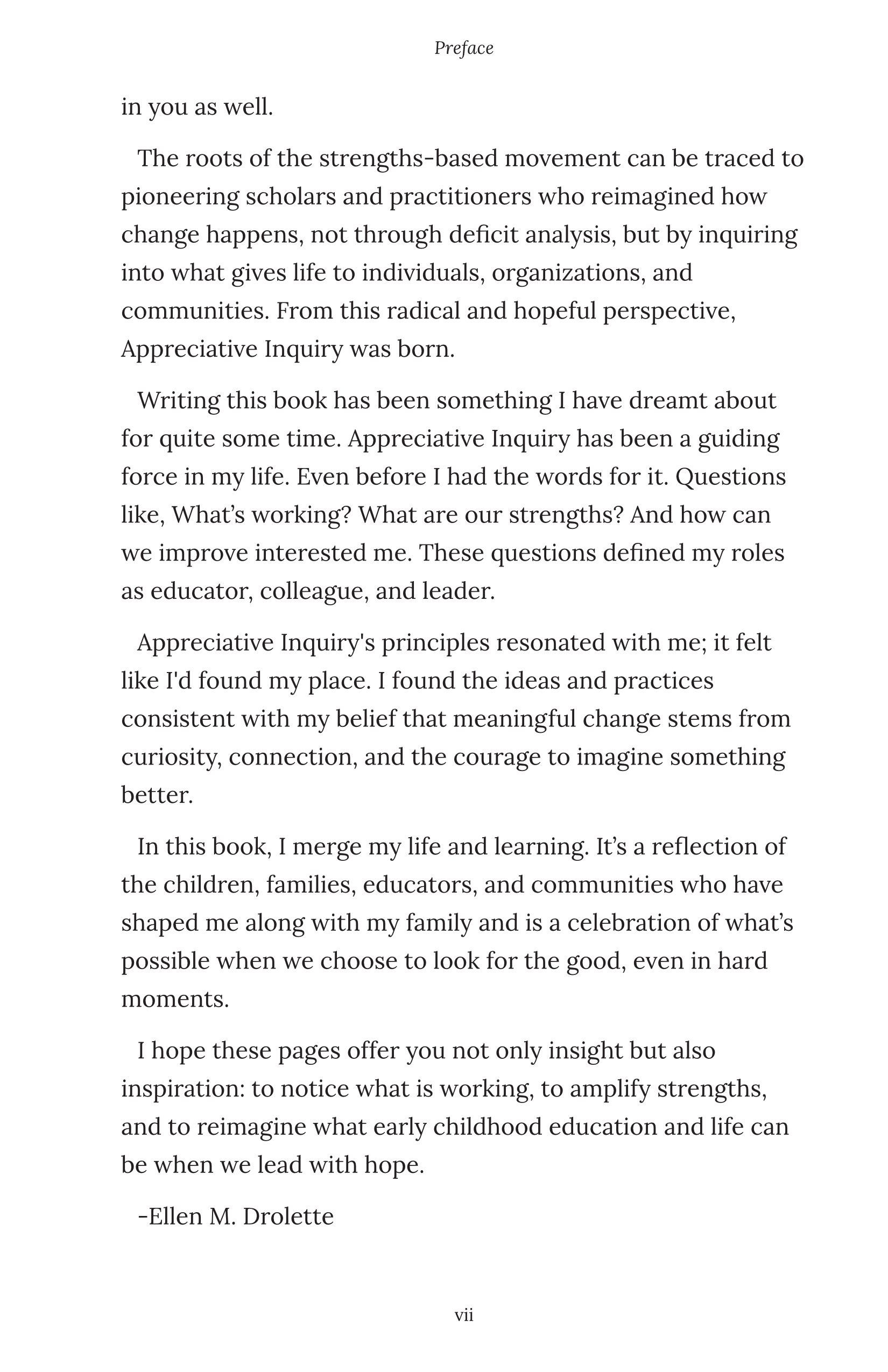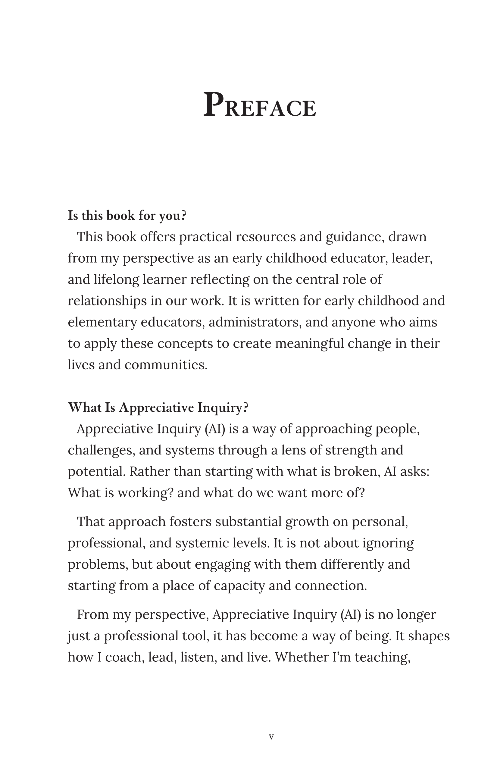 "This book is such a beautiful contribution to the field. It takes Appreciative Inquiry out of theory and brings it to life — in classrooms, in teams, in policy, and in our everyday work with children and families. Each principle is broken down with such clarity and care, paired with thoughtful, practical ways to put it into action. What I love most is how it expands your way of seeing — it cracks something open, inviting you to see the totality of possibilities that emerge when we lead with curiosity, strength, and appreciation. Thank you, Ellen, for the powerful reminder that real change begins in how we choose to see what and who is before us."