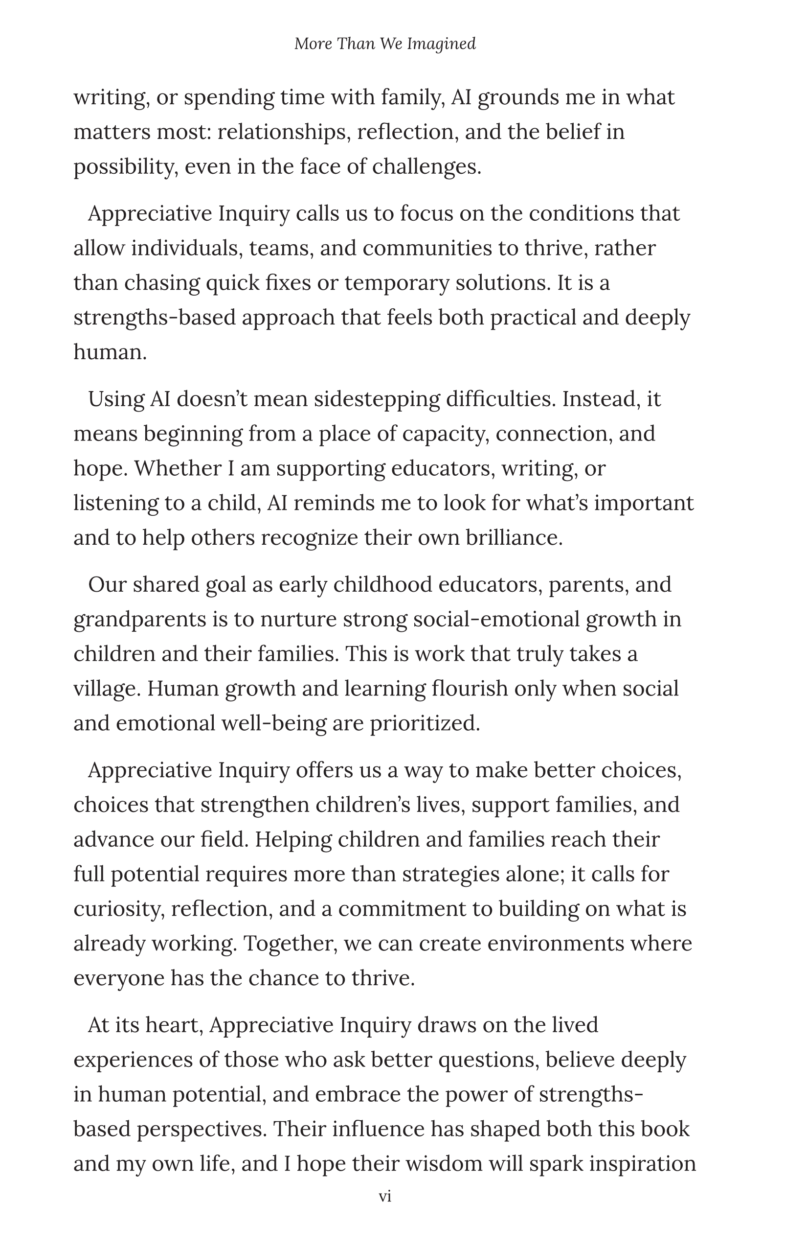 More Than We Imagined: Appreciative Inquiry for Early Childhood and Everywhere That Matters invites educators, leaders, and caregivers to reimagine what’s possible in early learning environments through a strengths-based, reflective lens. Grounded in the principles of Appreciative Inquiry, this book offers practical tools and inspiring stories that illuminate how joy, curiosity, and relationship-based teaching can transform classrooms, teams, and communities. With concepts like the Triple R Framework™ (Relevance, Relationship, Reflection), readers are guided to shift from problem-focused mindsets to possibility-driven practices that nurture both children and the adults who care for them.
